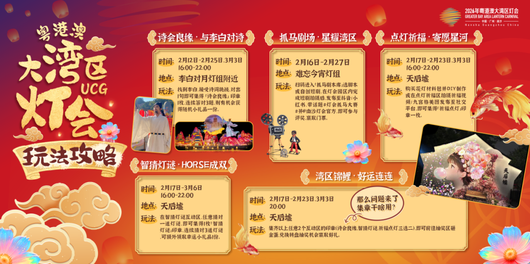 互动方式二:在点灯祈福互动区域,拍摄祈福视频或9宫格美图,带话题 #2026年粤港澳大湾区灯会# 发布至抖音/小红书/视频号并@官方账号,即可获得1枚「祈福点灯」印章。