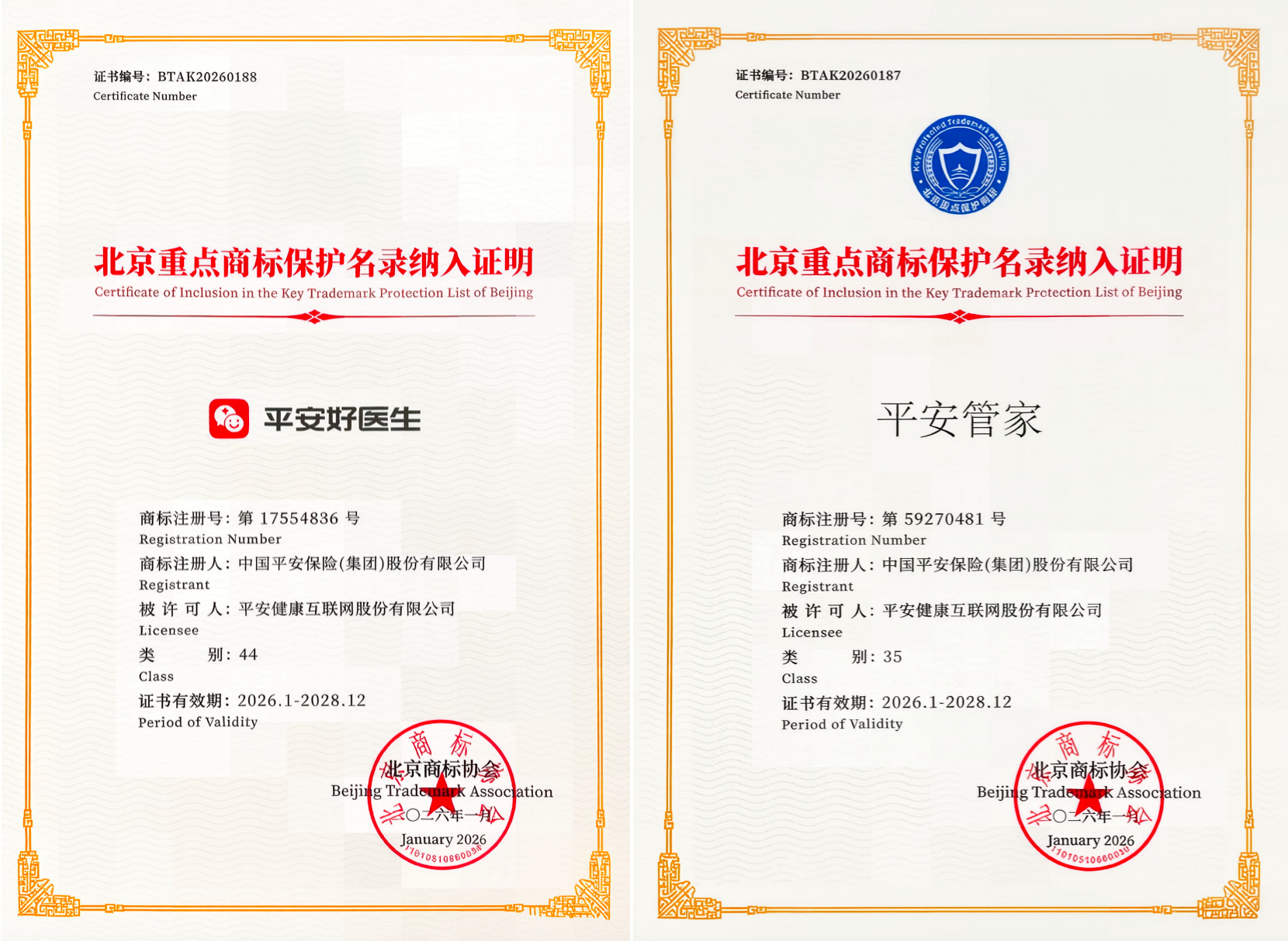 1月16日,由北京商标协会主办的“首届北京商标品牌盛典”在北京隆重举行。作为首都知识产权保护领域的年度盛事,大会正式发布2025年度“北京重点商标保护名录”(下称:名录)。中国平安旗下医养生态业务旗舰品牌“平安好医生”与居家养老服务品牌“平安管家”,凭借深厚的品牌积淀、卓越的市场公信力及扎实的业务护城河,经权威评审严格筛选,双双成功入选。